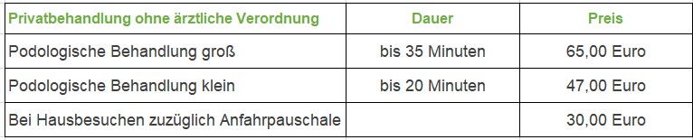 Die Vergütung setzt sich aus die Kosten für die therapeutische Leistung und für die Vor-, Nachbereitung und Dokumentation und für die Sachkosten im Zusammenhang mit der Aufbereitung des Raumes und der Instrumente sowie die für die podologische Therapie üblicherweise erforderlichen Hygienemaßnahmen des Therapeuten zusammen.